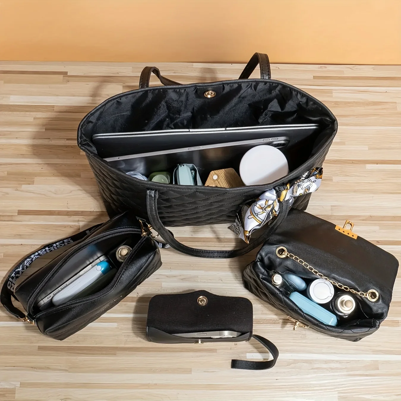 4 pieces of women's fashionable diamond grid quilted silk scarves, hand-held single shoulder diagonal cross set bag