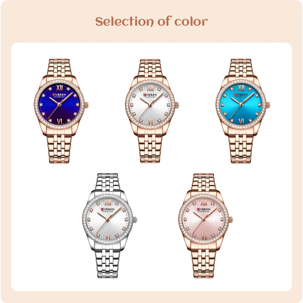 CURREN Classy Dress Watches for Women Stainless Steel Band Clock Female Rhinestone Dial Slim Wristwatches Ladies