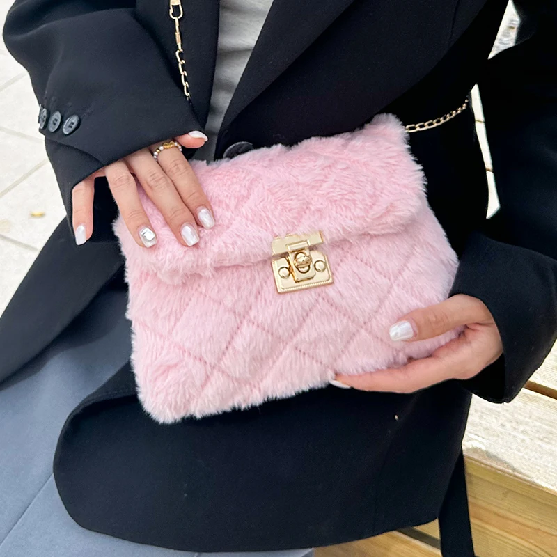 Fashionable single-shoulder plush small square bag, versatile and exquisite turn-lock crossbody bag