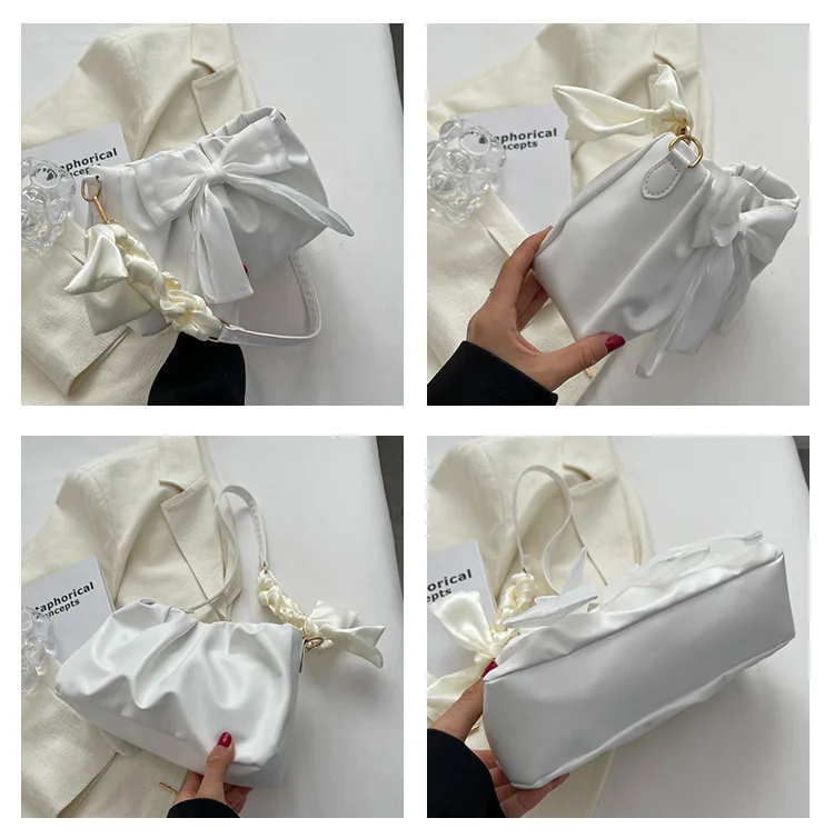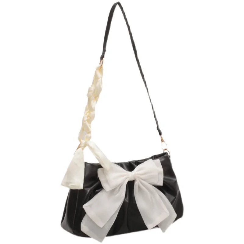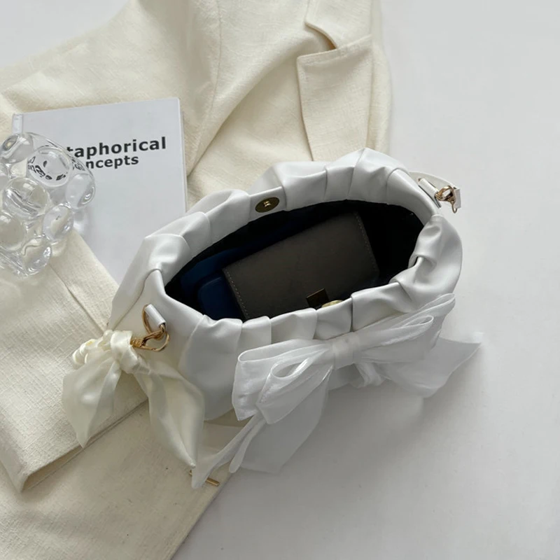 Lovely Bow Handbags for Girls Ladies Fashion Pleated Shoulder Bags for Women Simple Design Female Underarm Bag Casual Tote Purse