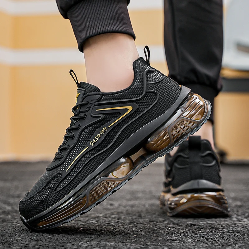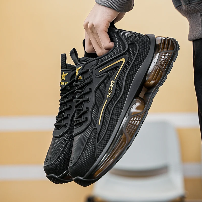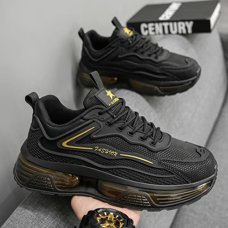 Men's High-Top Running Shoes - Breathable Synthetic Upper, Comfortable Cushioning and Durable Rubber Sole, Suitable for Year-Round Training, Fitness, Jogging - Black with Gold Accents, Sneakers, Streamlined Athletic Design, Lining Fabric