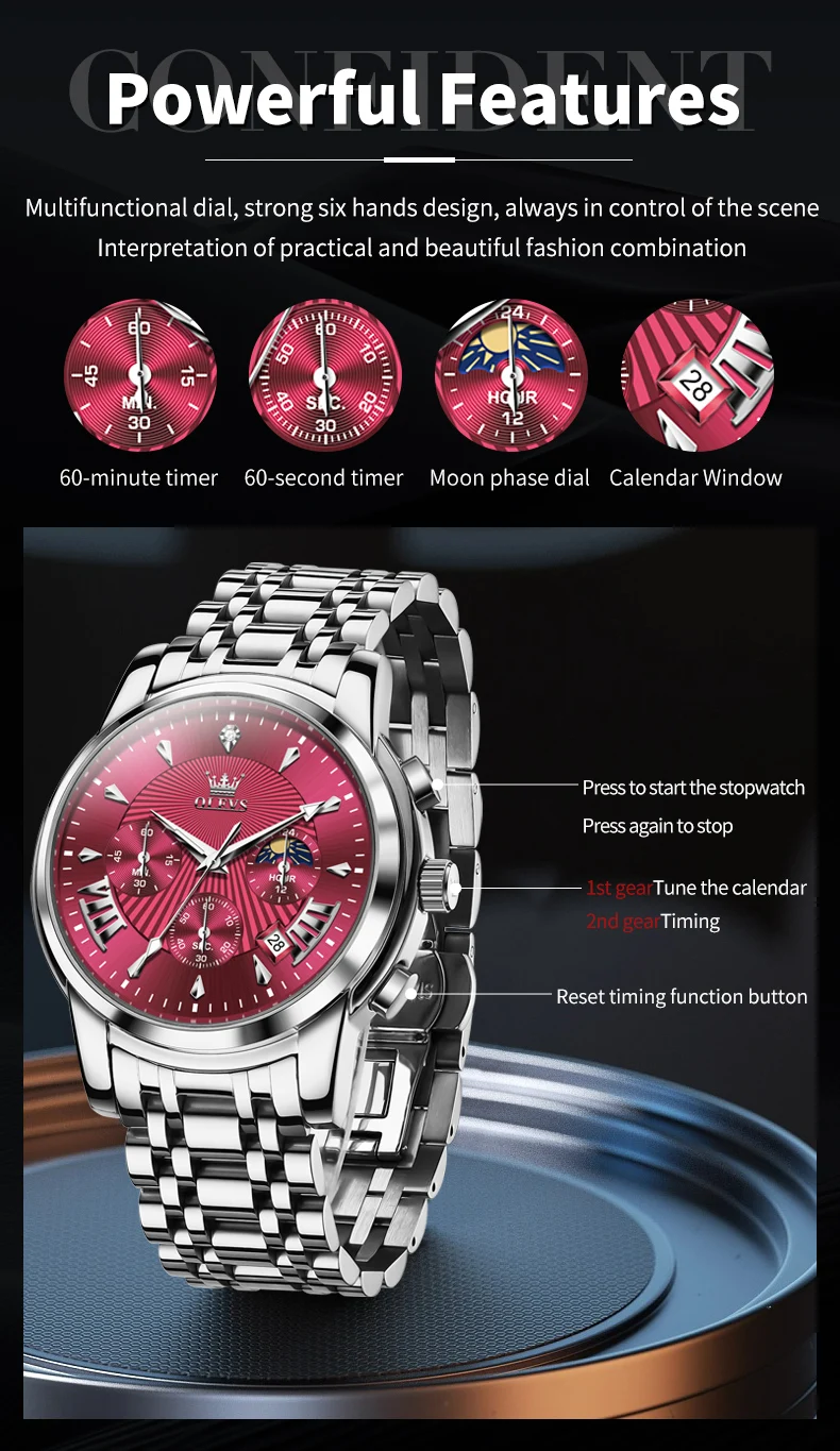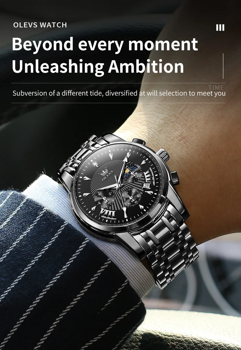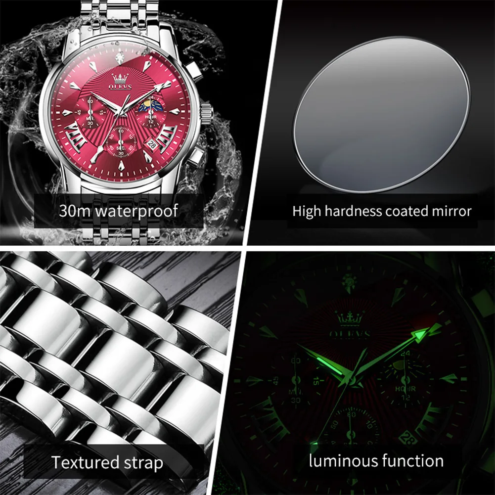 - Feature: Shock Resistant,Luminous,Chronograph,Complete Calendar,Moon Phase,Multiple Time Zone,Water-Resistance,swim,Anti-Magnetic,Luminous Hands