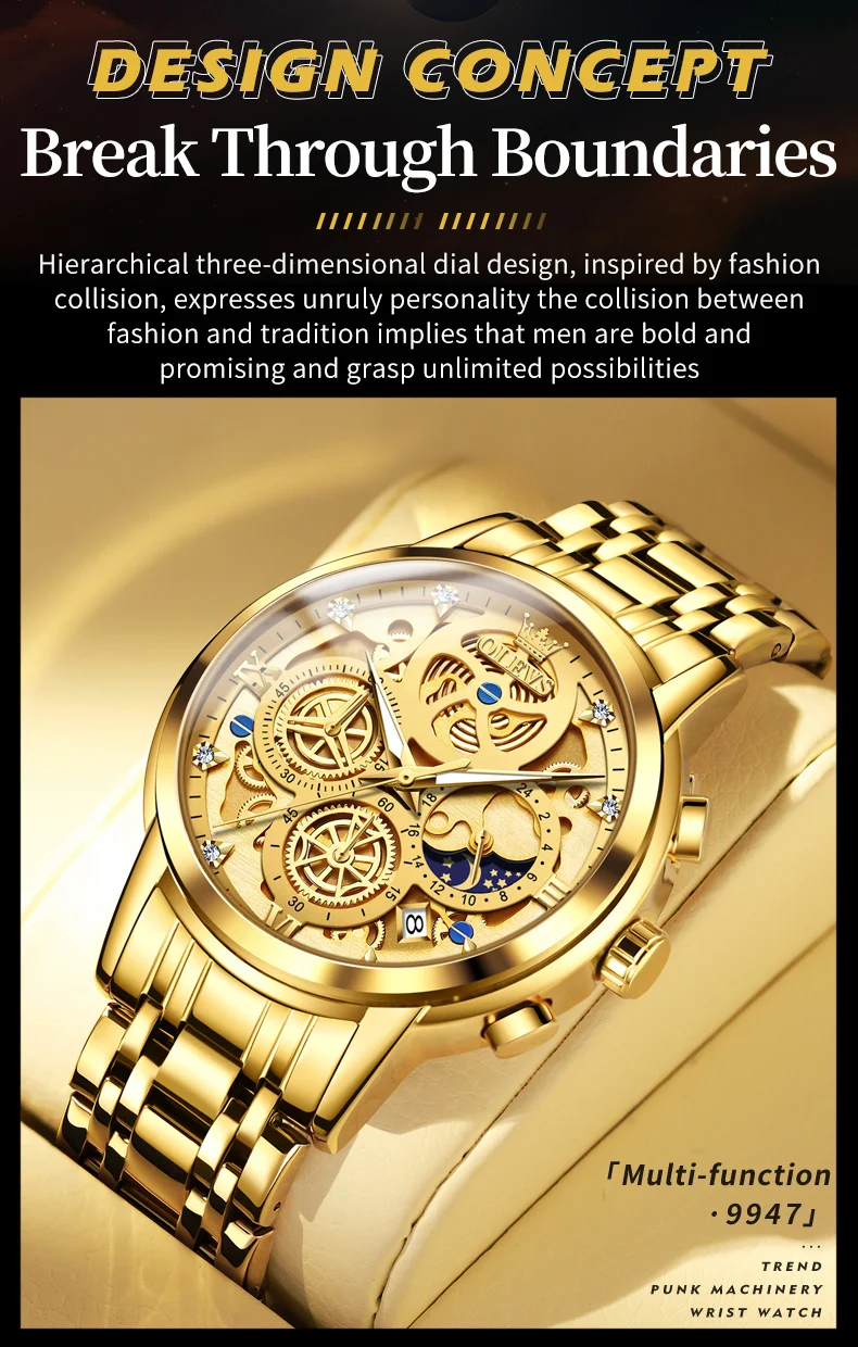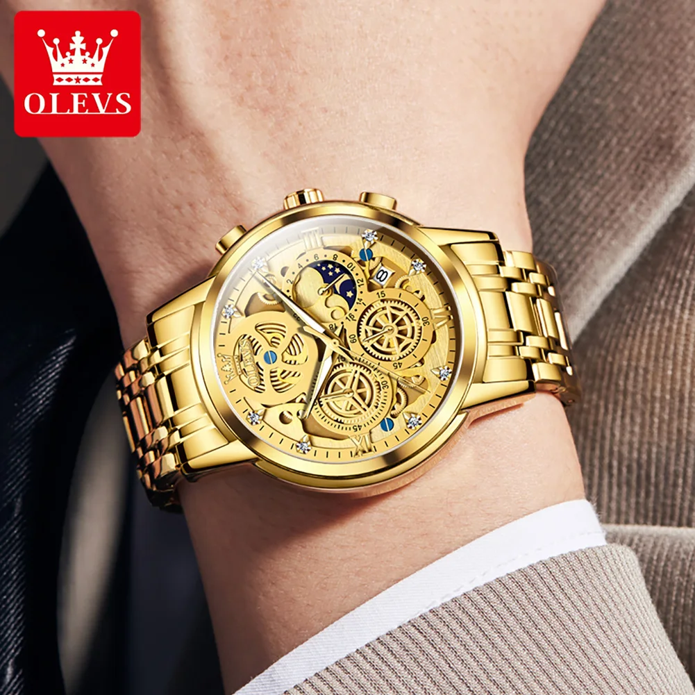 OLEVS 9947 Men Watch Original Luxury Brand Quartz Watch Advanced Waterproof All Gold Skeleton Watch 24-hour Moonphase Men Watch